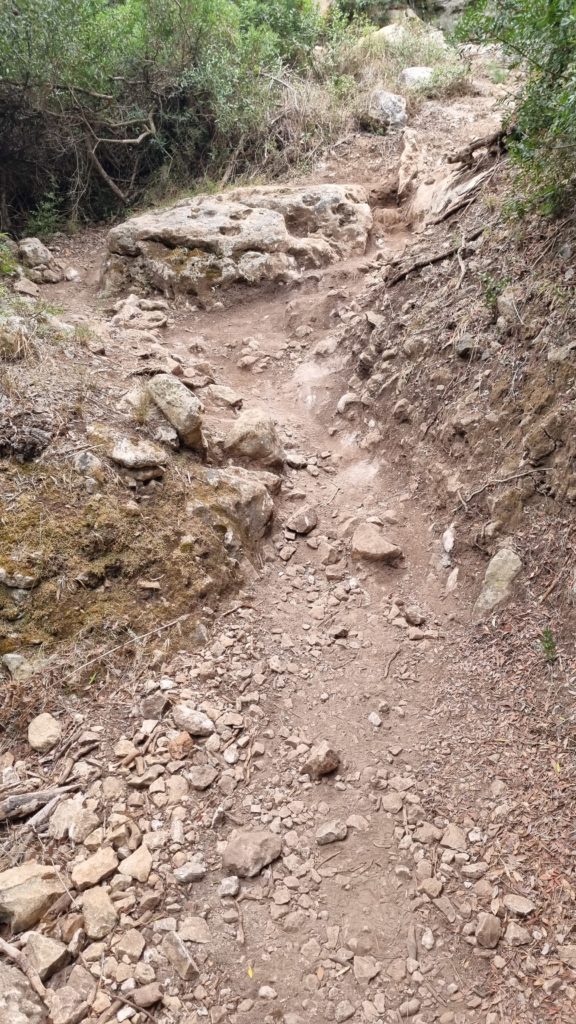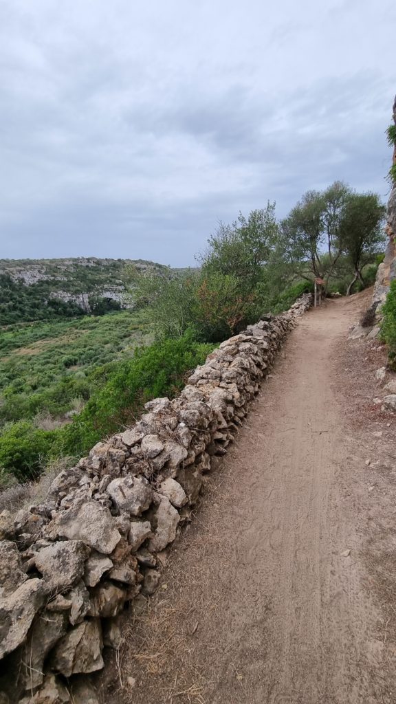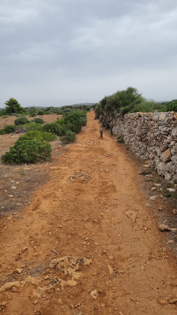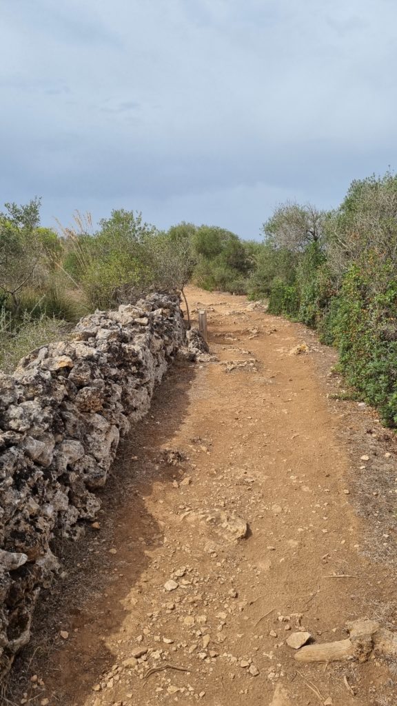 La suite du parcours devient un peut plus « pénible.. » . On part à l’arrière de Cala en Porter pour suivre un sentier fait de « caillasse » et de rocher , qui longe des murs de pierres..