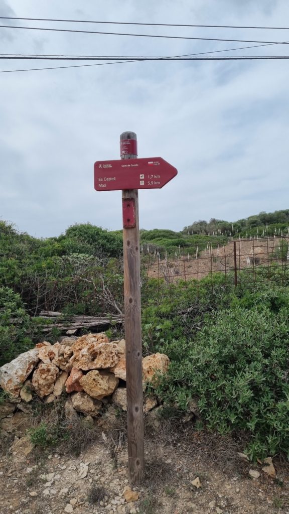 Le parcours remonte à l’arrière de Cala Saint Esteve , pour rejoindre un plateau , un panneau nous indique Mahon à 6km.